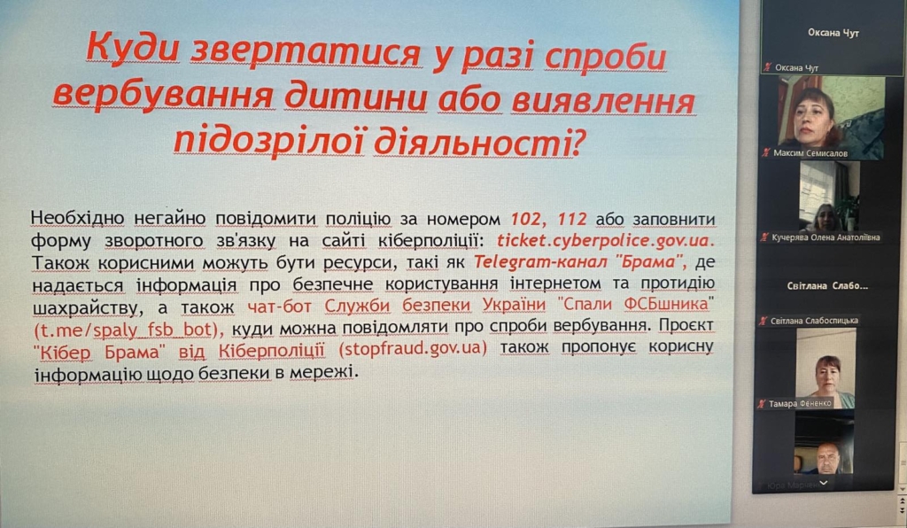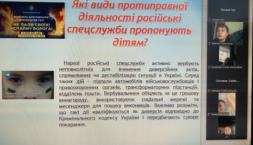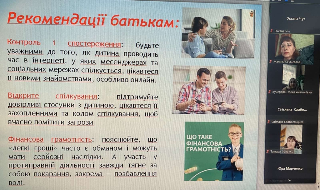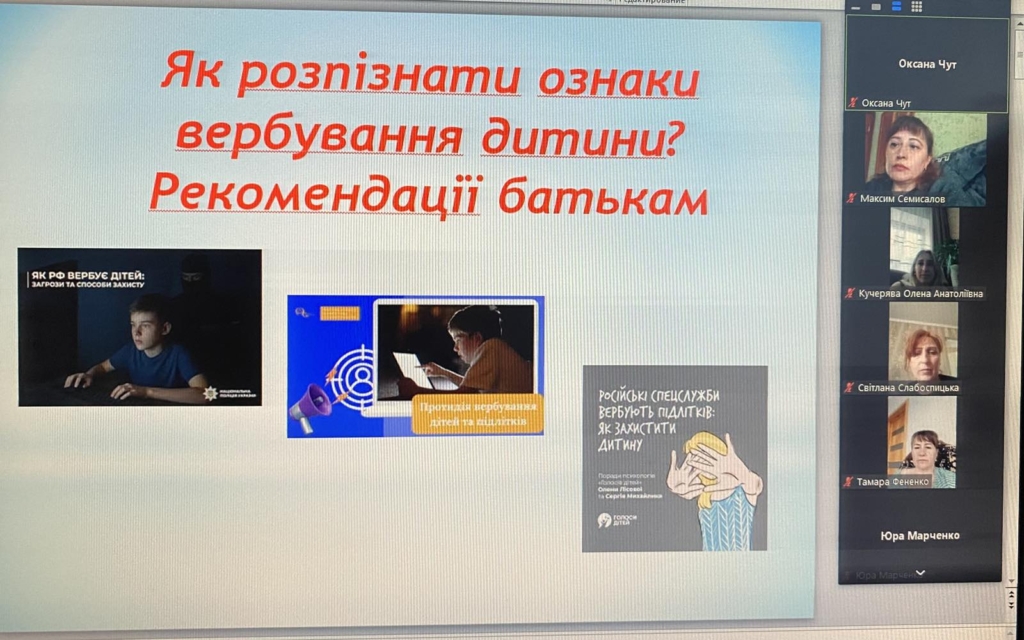 Наступним етапом батьківських зборів було спілкування батьків з куратором. Темою спілкування була: «Як розпізнати ознаки вербування дитини? Рекомендації батькам» Під час спілкування куратор наголосила на що потрібно звертати увагу, щоб розпізнати ознаки вербування. Також були надані рекомендації батькам, щоб запобігти вербуванню дітей. Ще куратор звернула увагу, чому підлітки є вразливою групою для вербування, які види протиправної діяльності російські спецслужби пропонують дітям, яка відповідальність передбачена за диверсійну діяльність, у тому числі для неповнолітніх, які заходи безпеки необхідно вживати дітям в соціальних мережах, та куди звертатися у разі спроби вербування дитини.