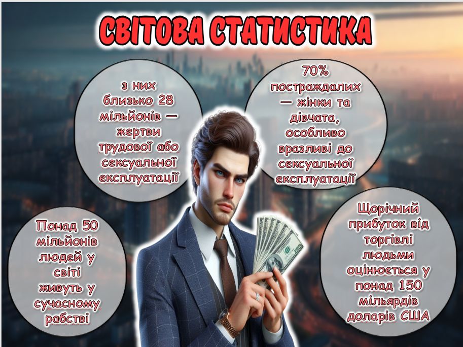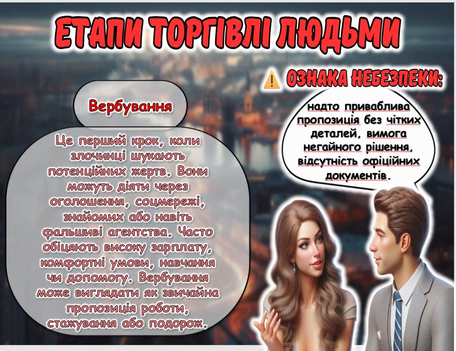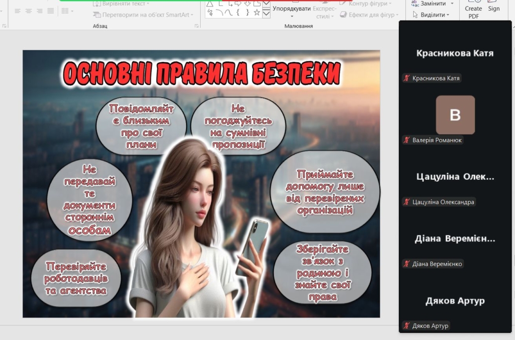 Студенти проаналізували етапи торгівлі людьми — від вербування та перевезення до експлуатації — та розглянули реальні історії постраждалих, що допомогло глибше усвідомити серйозність проблеми. Окрему увагу було приділено ознакам, за якими можна розпізнати потенційну небезпеку, та правилам безпечної поведінки під час пошуку роботи, подорожей за кордон чи спілкування в інтернеті.