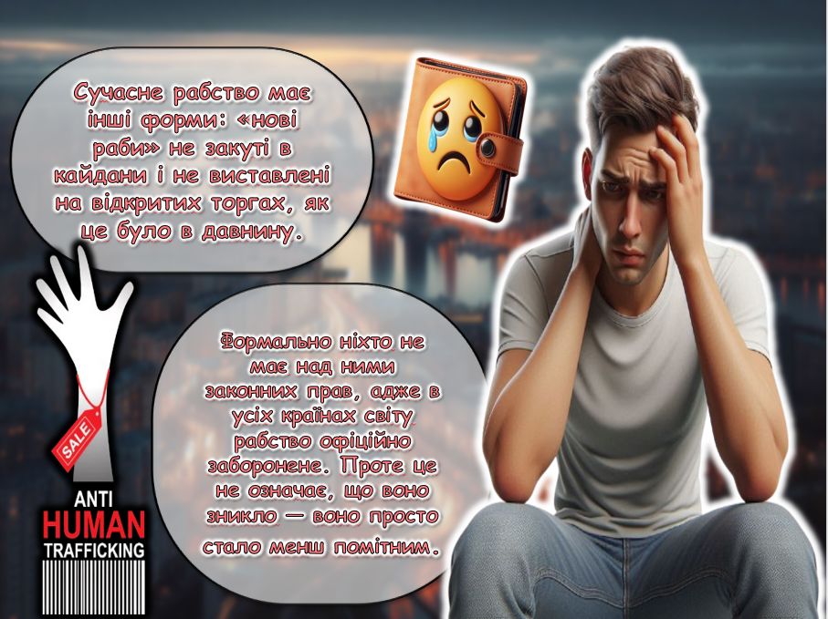 Під час виховної години студенти дізналися, що таке сучасне рабство, які існують його основні форми — трудова, сексуальна експлуатація, жебрацтво, примусові шлюби, використання дітей у злочинній діяльності. Було розглянуто причини поширення цього явища, зокрема безробіття, довірливість, бажання швидкого заробітку за кордоном, недостатню поінформованість населення