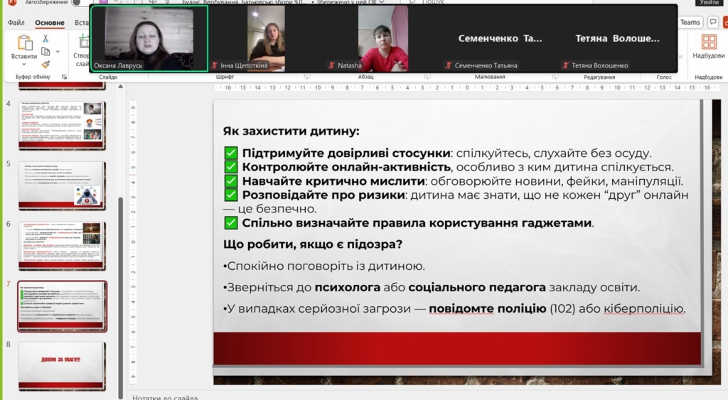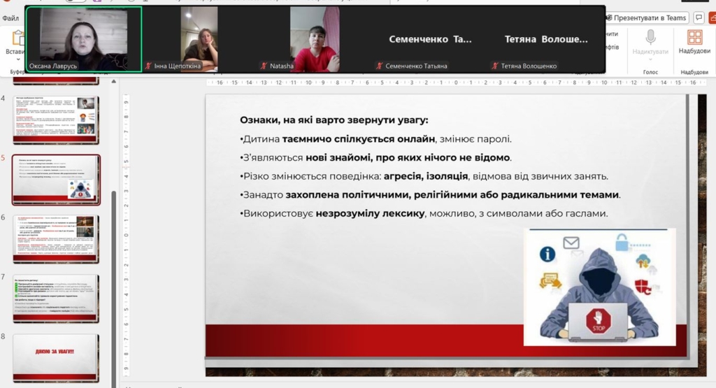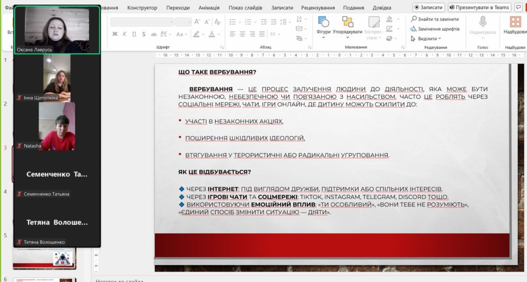 В умовах сьогодення зросла загроза використання підлітків у злочинних та диверсійних цілях. Через вербування, маніпуляції, шантаж, психологічний тиск або грошову винагороду ворог намагається залучити дітей до незаконної діяльності. Украй важливо навчати здобувачів освіти та розповідати батькам про правила інформаційної безпеки, пояснювати ризики спілкування в онлайн-середовищі, формувати навички безпечної поведінки в Інтернеті.