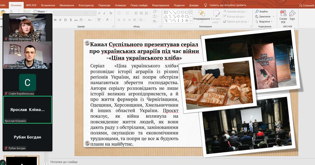 Заміновані поля, небезпечні маршрути, пошкоджена спец. техніка, ракетні удари підчас збору врожаю зерна – це те з чим зараз мають справу фахівці даної спеціальності. Доречним також був перегляд фрагменту документального серіалу про українських аграріїв під час війни -«Ціна українського хліба», презентація якого не так давно відбулася на каналі Суспільного.