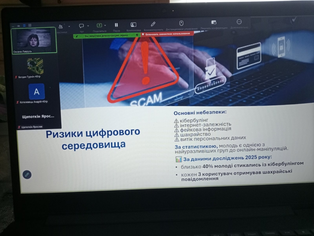 Під час заходу студенти обговорили особливості цифрового покоління, переваги сучасних технологій та ризики цифрового середовища, зокрема кібербулінг, фейкову інформацію, інтернет-шахрайство і витік персональних даних. Учасники виконали інтерактивні вправи, під час яких навчалися розпізнавати фішингові повідомлення та перевіряти достовірність інформації.