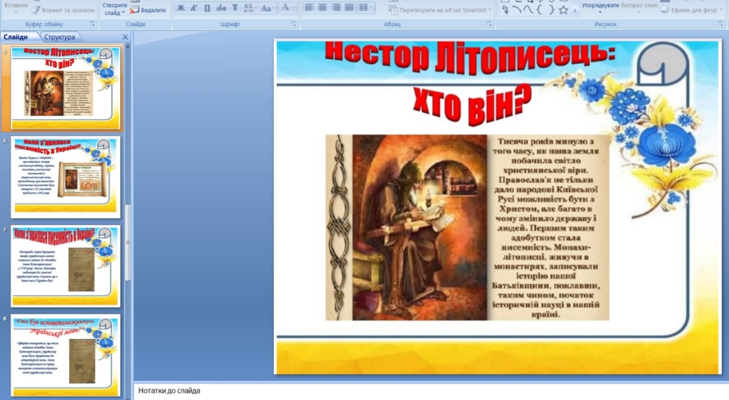 У 14 групі проведено годину спілкування, присвячену Дню української писемності та мови,який відзначається 27 жовтня. Студенти пригадали історію цього свята, дізналися про його зв’язок із днем пам’яті преподобного Нестора Літописця — першого літописця Русі, який заклав основу для розвитку українського слова та культури.