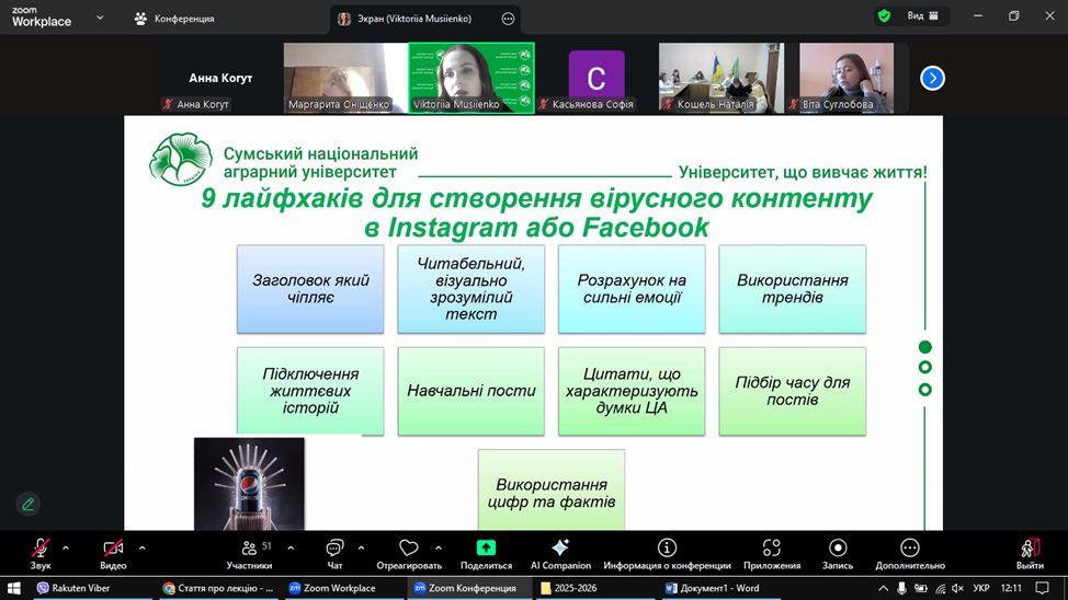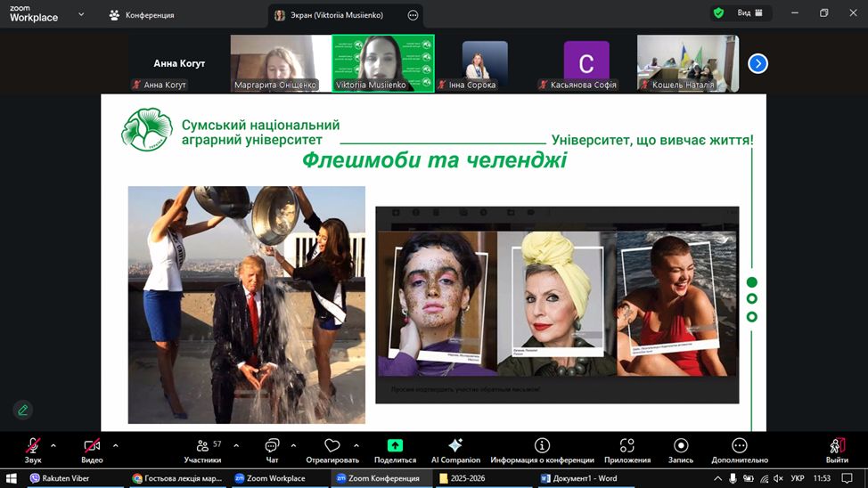 Студенти дізналися про інструменти, які допомагають відстежувати динаміку трендів у TikTok, Instagram і YouTube, а також про роль штучного інтелекту в створенні контенту. У ході лекції студенти переглядали відомі вірусні відеоролики, аналізували їхній зміст.