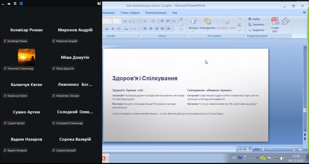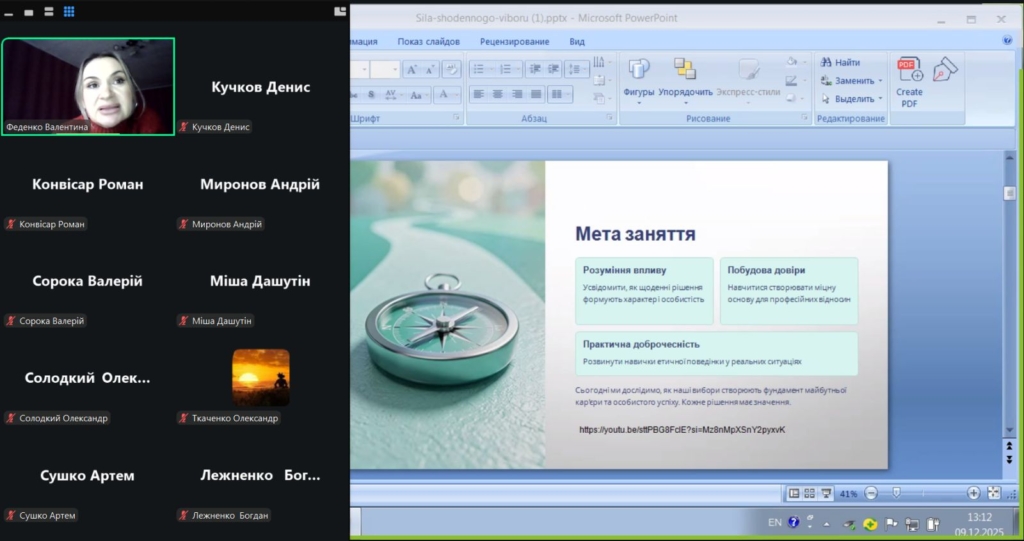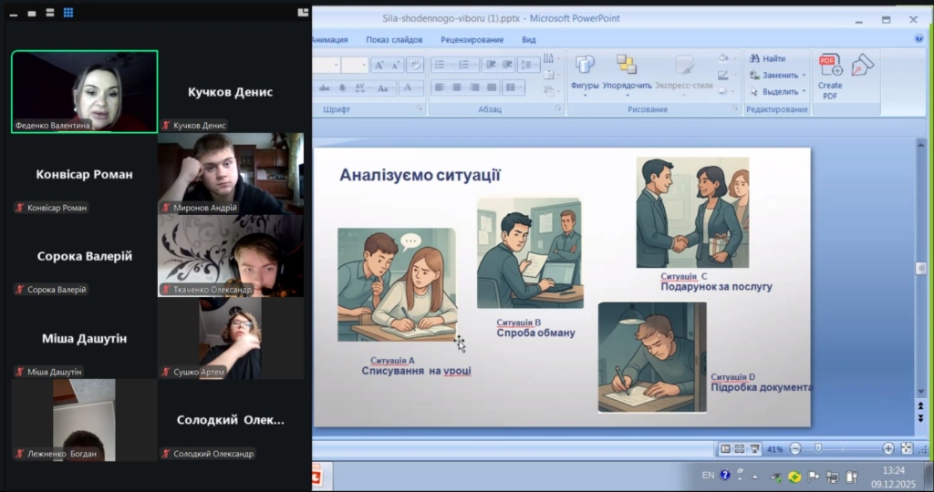 9 грудня в 11 групі було проведено інтерактивне заняття «Сила щоденного вибору», спрямоване на формування доброчесності та розвиток етичної поведінки. Захід поєднав дискусії, вправи, аналіз життєвих ситуацій і сучасні цифрові інструменти для того, щоб показати, що доброчесність — це не абстракція, а щоденні рішення, які формують характер і професійну репутацію людини.