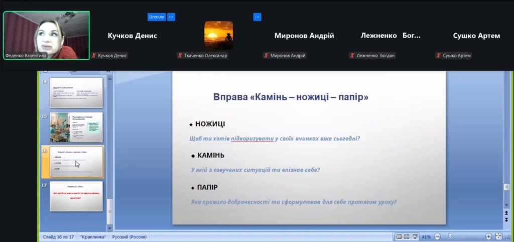 На завершення студенти виконали рефлексивну вправу «Камінь – ножиці – папір», визначивши: яку рису поведінки хочуть покращити вже сьогодні, у яких ситуаціях упізнали себе, яке правило доброчесності стане їхнім особистим дороговказом.