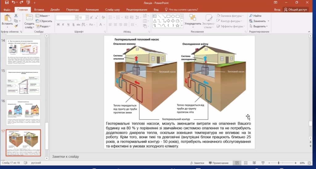 Також значну увагу було приділено тепловим насосам — одним із найперспективніших напрямів у сучасному будівництві. Андрій Чепіжний пояснив принцип їхньої роботи, розповів про повітряні теплові насоси, які використовують енергію навколишнього повітря для обігріву приміщень. Лектор детально охарактеризував переваги таких систем (економічність, екологічність, універсальність у використанні) та виклики, з якими стикаються проєктанти під час їх впровадження.
