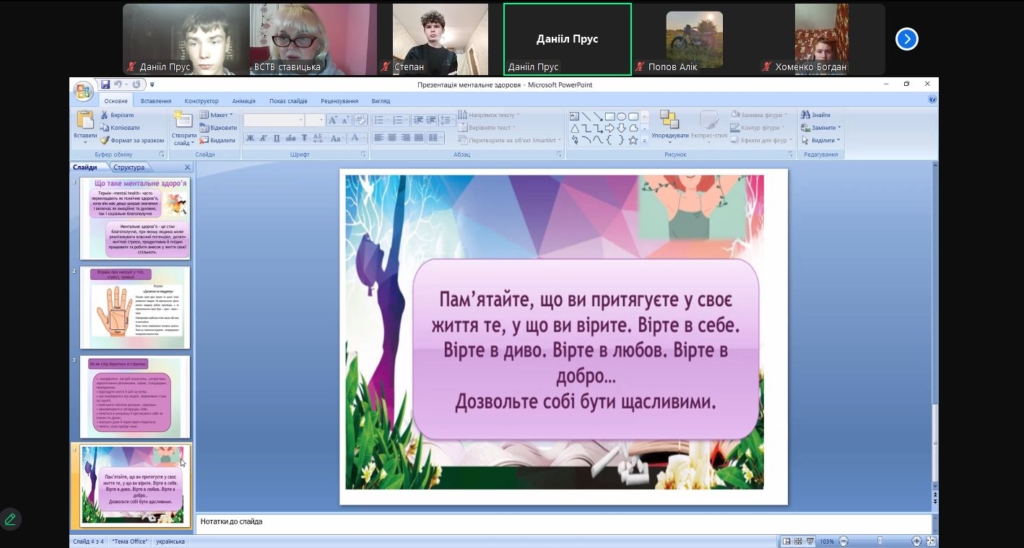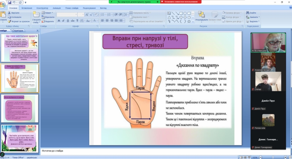 Під час заходу студенти переглянули презентацію з корисними порадами, дізналися про основні ознаки ментального виснаження та способи відновлення енергії. У невимушеній атмосфері відбулося жваве обговорення під час якого всі учасники ділилися власними спостереженнями, думками про життя, щастя та внутрішню силу.