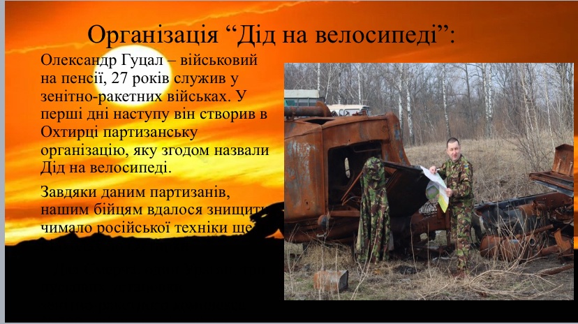 Організація “Дід на велосипеді”: Цю назву придумали артилеристи 93 бригади, яким партизани передавали координати ворожих колон. Своєрідним “прототипом” назви став один із партизанів, 54-річний Інжин Олексій, житель села Іванівка. Саме він надав дуже точні, цінні вказівки по ворожій колоні, яка знаходилася на той час в селі Катанському. В результаті вогневого удару артилеристи 93-ї бригади при цьому знищили дві установки “Смерч”, три танки, дві БМП. Партизанська мережа на території Охтирського району складалася з 15 людей, з них 5 жінок. Наймолодшому учаснику було 24 роки, найстаршій жінці – 69.