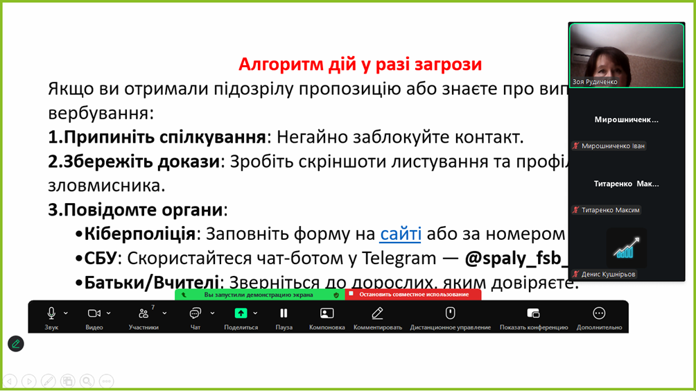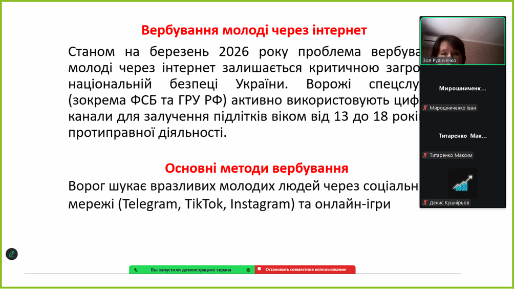 З цією метою 6 березня 2026 року в 18 групі була проведена година спілкування на тему: «Вербування молоді через інтернет: методи вербування, алгоритм дії в разі загрози, адміністративна та кримінальна відповідальність» Викладач: Рудиченко З.Ш.