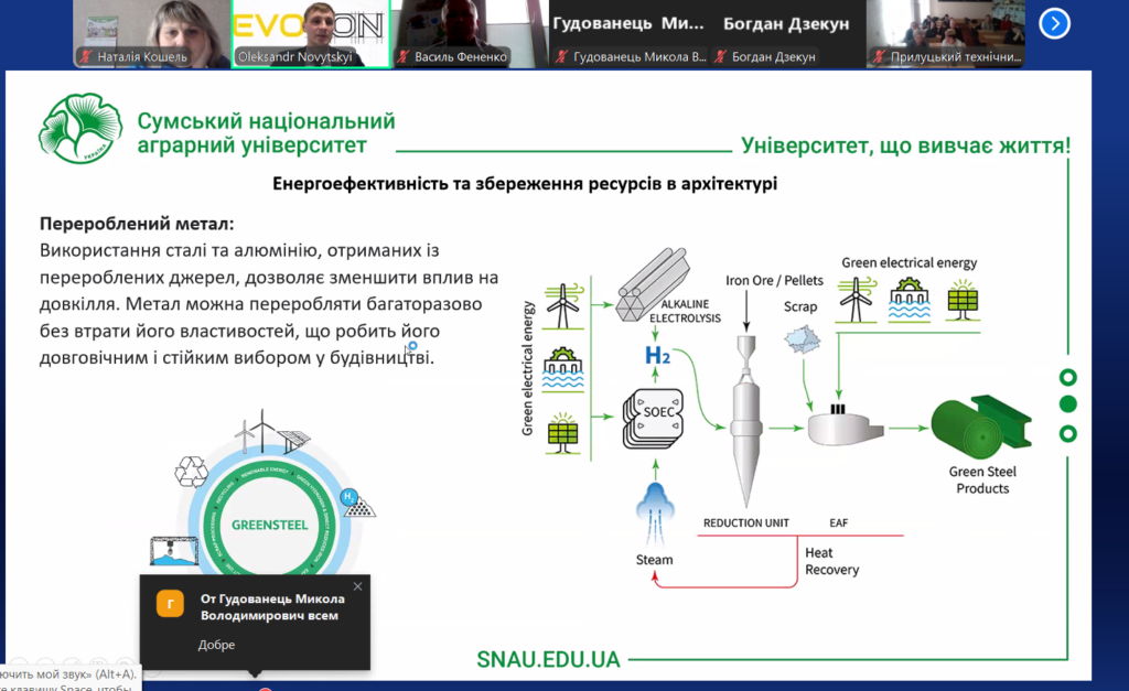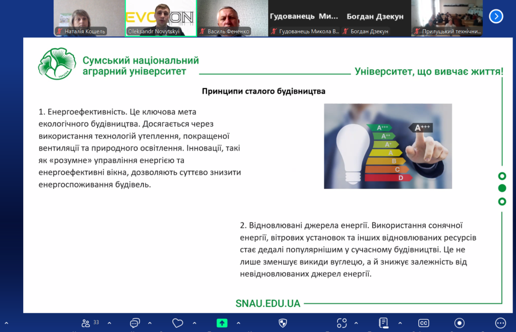 На лекції були присутні студенти спеціальності 192 Будівництво та цивільна інженерія Прилуцького технічного фахового коледжу, Немирівського фахового коледжу будівництва, економіки та дизайну ВНАУ та Охтирського фахового коледжу СНАУ.. Учасники мали змогу ознайомитися з сучасними енергозберігаючими технологіями в будівництві, їх впровадженням та перспективами розвитку.