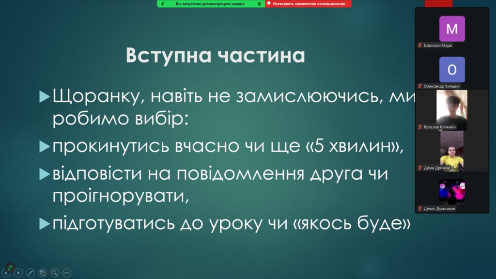 Заняття розпочалося з вправи «Продовж думку», яка допомогла студентам сформулювати власне розуміння доброчесності. У підсумку учасники дійшли висновку, що бути доброчесним – це не лише не списувати, а й говорити правду, визнавати власні помилки, поважати чужу думку, діяти чесно навіть тоді, коли ніхто не бачить. Такий мікропідсумок став міцною основою для подальших активностей.