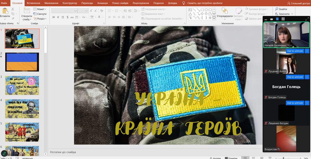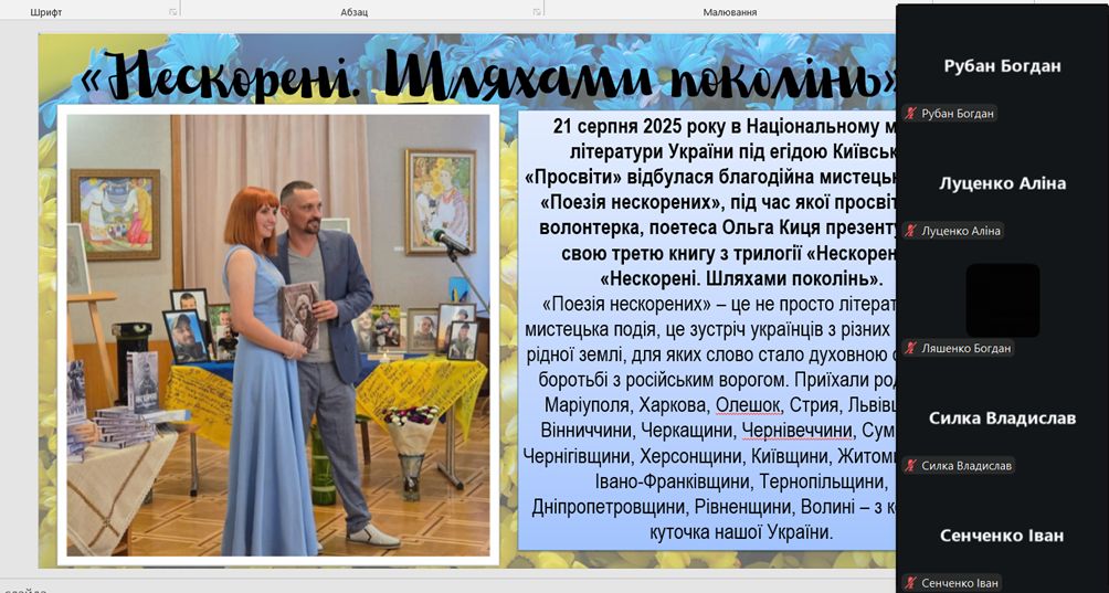 1 вересня відбулася виховна година в 24 групі, яка розпочалася з вшанування памяті загиблих українців хвилиною мовчання. Студенти вели дискусію і давали відповідь на питання «Що значить бути героєм?» і «Кого вони вважають героєм?», адже герої не лише на полі бою, а й у слові, мистецтві, науці, медицини. Згадали початок війни….і кому ми завдячуємо прийдешньому ранку. Не могли не згадати презентацію книги поетеси «Нескорені. Шляхами поколінь» Ольги Киця, яка відбулася 21 серпня 2025 року в Національному музеї літератури України під егідою Київської «Просвіти». На цю, літературно-мистецьку подію приїхали родини героїв з кожного куточка нашої України. Книжка «Нескорені. Шляхами поколінь» була ілюстрована художніми роботами українського художника, просвітянина Володимира Реброва. І сьогодні, дивлячись на його твори, те як він зображує наших герої доречним буде вислів Вячеслава Чорновіла -“НАЦІЯ ЯКА МАЄ СВОЇХ ГЕРОЇВ, БЕЗСМЕРТНА”.Тому починаючи новий навчальний рік, ми згадали полеглих героїв і що значить бути справжнім УКРАЇНЦЕМ!