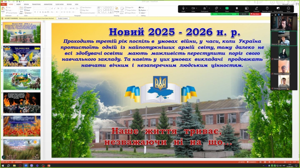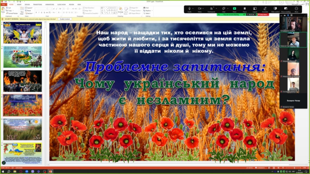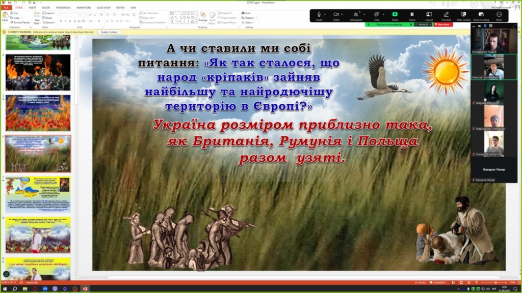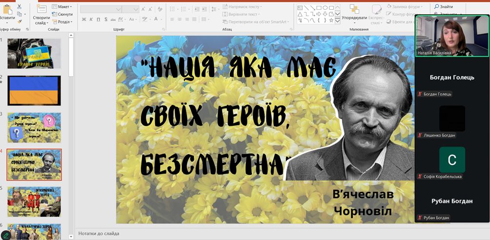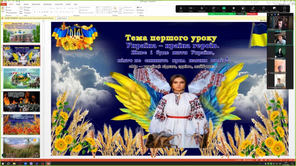 Сьогодні, 1 вересня, ми з групою 322 спеціальності «Комп’ютерні науки» провели онлайн-виховну годину під назвою «Україна — країна героїв». Ми вшанували пам’ять полеглих героїв, згадали наших знайомих, які віддали життя за нашу можливість навчатися. Також переглянули патріотичну презентацію і обговорили актуальні питання навчання в умовах війни. У підсумку ми ще раз переконалися в нашій єдності та патріотизмі.