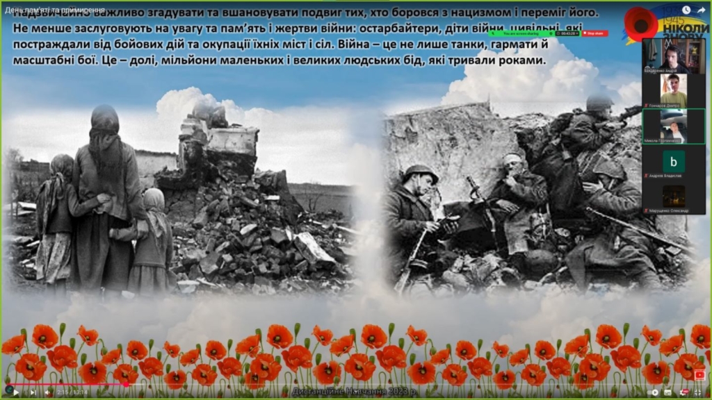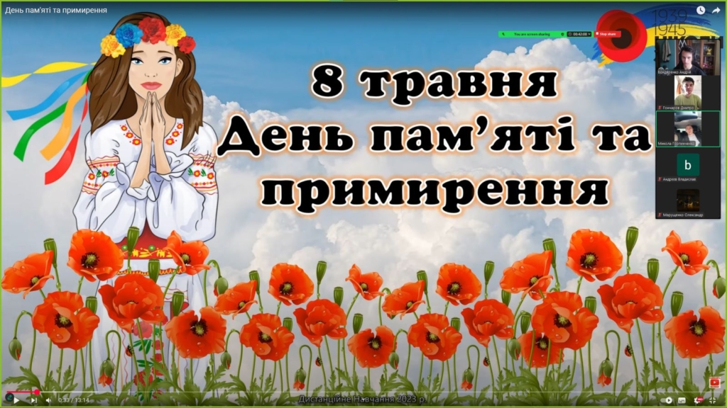 Під час виховної години ми згадали важливість Дня пам’яті та примирення, вшановуючи пам’ять тих, хто загинув у Другій світовій війні. Ми обговорили значення цієї дати для нашої країни та світу, а також вшанували героїв, які боролися за мир.Важливо пам’ятати, що мир і свобода – це цінності, які ми маємо берегти та захищати.Ця виховна година стала нагадуванням про те, що мир – це наша спільна відповідальність.