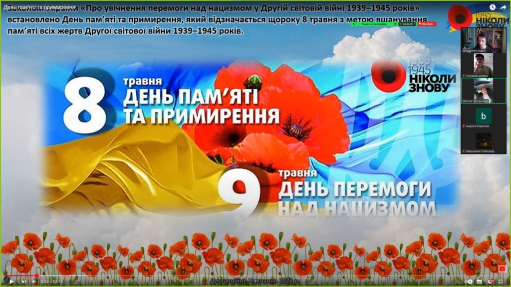 6 травня 2025р. в 222 групі спеціальності “Комп’ютерні науки” відбулася виховна година до Дня пам’яті та перемоги над нацизмом у Другій світовій війни 1939-1945 років.