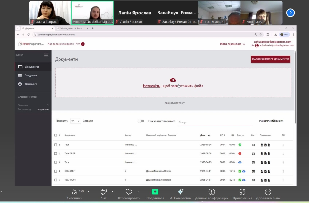 Спікер заходу — Анна Чудак, менеджер з розвитку компанії Strikeplagiarism, ознайомила учасників із оновленнями функціоналу системи, новими можливостями для виявлення плагіату та інтеграцією платформи в освітній процес. Учасники отримали практичні рекомендації щодо ефективного використання інструментів Strikeplagiarism, а також мали змогу поставити запитання та обговорити актуальні виклики у сфері академічної доброчесності.