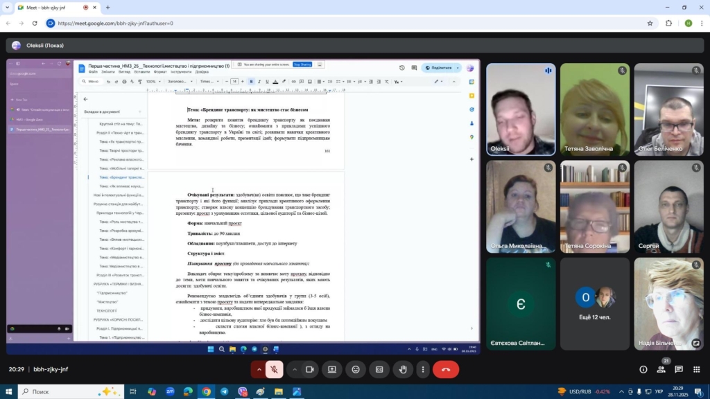 28 листопада 2025 року відбулася онлайн-консультація щодо впровадження інтегрованого курсу «Технології, мистецтво і підприємництво». До участі долучилися викладачі коледжу, відповідальні за реалізацію даного освітнього компоненту.Захід проведено в межах плану методичної підтримки викладачів. Під час зустрічі учасники отримали роз’яснення щодо особливостей упровадження курсу та підходів до інтеграції міждисциплінарних зв’язків.