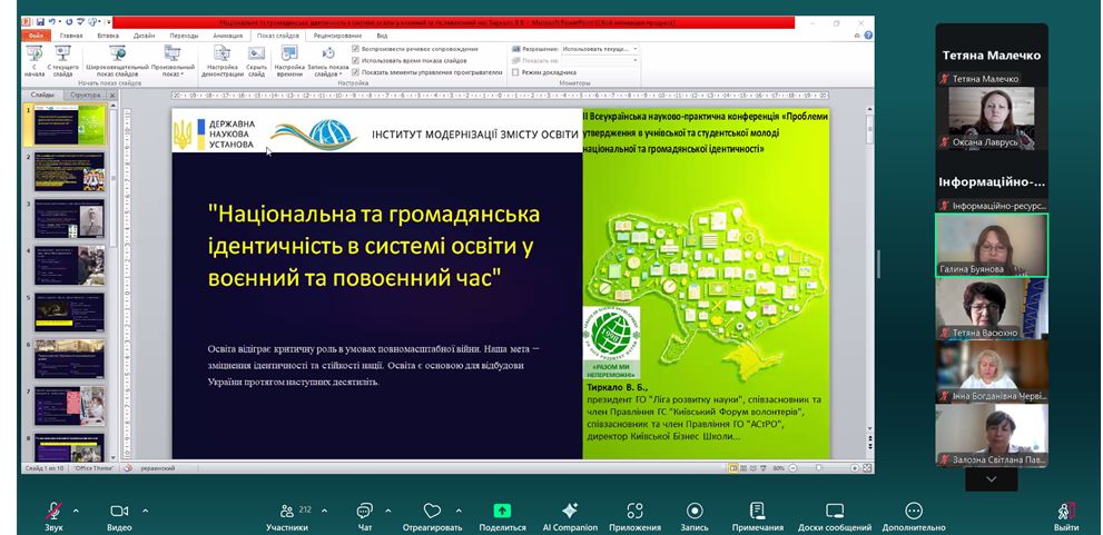 19 червня 2025 р. відбулася ІІ Всеукраїнська науково-практична конференція «Проблеми утвердження в учнівської та студентської молоді національної та громадянської ідентичності». Організаторами заходу є Національна академія педагогічних наук України, Інститут проблем виховання НАПН України, Державна наукова установа «Інститут модернізації змісту освіти», Громадська організація «Всеукраїнське громадське об’єднання «Національна та громадянська ідентичність».