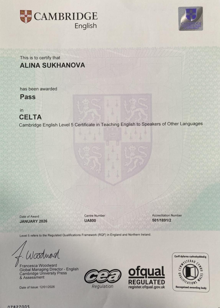 Викладач іноземної мови Аліна Суханова успішно пройшла навчання та отримала сертифікат Cambridge CELTA. Ця кваліфікація є “золотим стандартом” у світі, оскільки її видає екзаменаційний департамент Кембриджського університету.