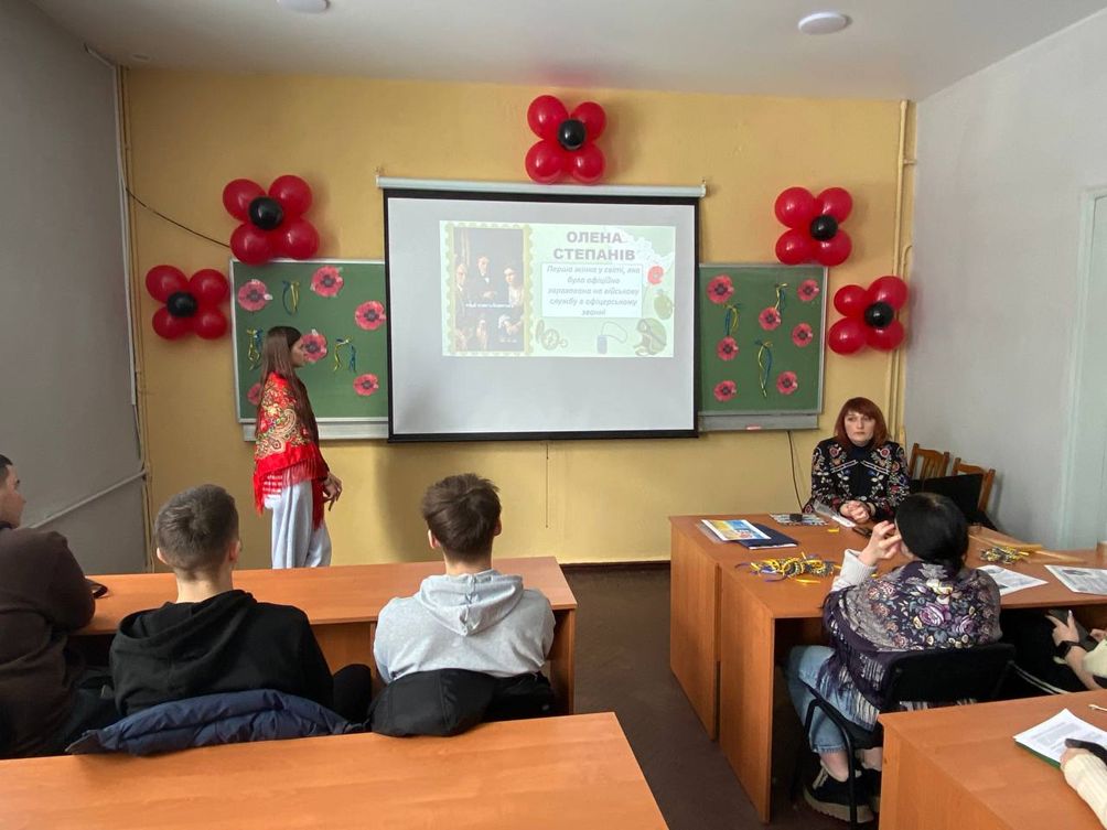 Викладачі Уткіна С.О., та Кулик Н.В. провели паралель із сучасними реаліями. Українські жінки і сьогодні ведуть боротьбу, причому не лише зі зброєю в руках. Вони служать у Збройних силах України, працюють медиками, волонтерами, операторками дронів, журналістами, виховують дітей під обстрілами, підтримують тил і об’єднують країну. Вартість цієї боротьби залишається надзвичайно високою.